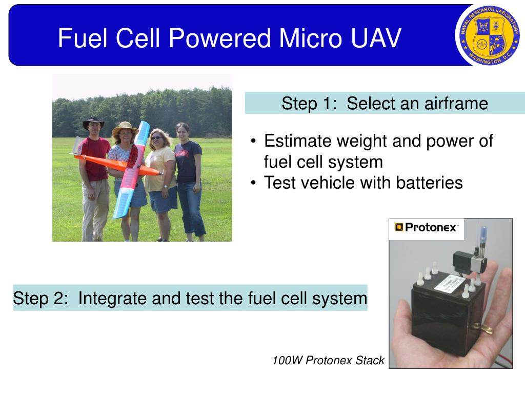 Fuel Cell Powered Micro UAV Step 1: Select an airframe • Estimate weight and power of fuel cell system • Test vehicle with batteries Step 2: Integrate and test the fuel cell system 100W Protonex Stack