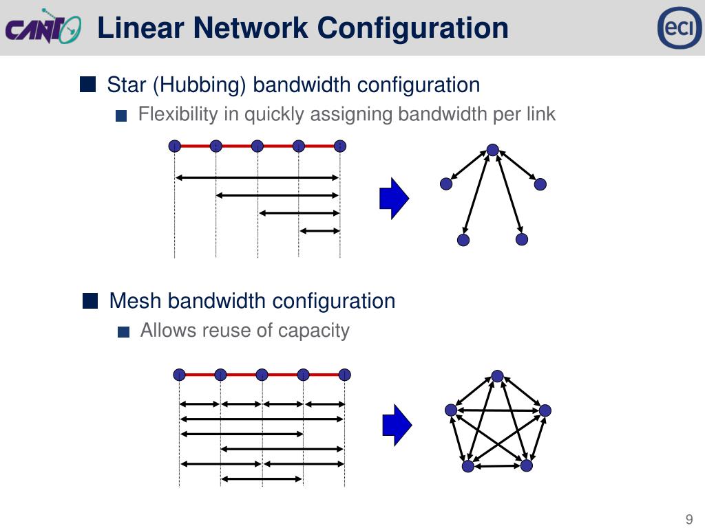 Linear Network Configuration • Star (Hubbing) bandwidth configuration • Flexibility in quickly assigning bandwidth per link • Mesh bandwidth configuration • Allows reuse of capacity