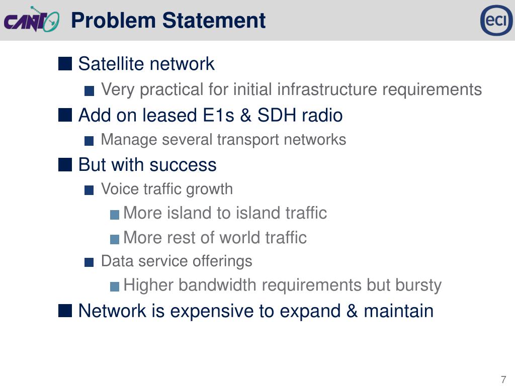 Problem Statement • Satellite network • Very practical for initial infrastructure requirements • Add on leased E1s & SDH radio • Manage several transport networks • But with success • Voice traffic growth • More island to island traffic • More rest of world traffic • Data service offerings • Higher bandwidth requirements but bursty • Network is expensive to expand & maintain