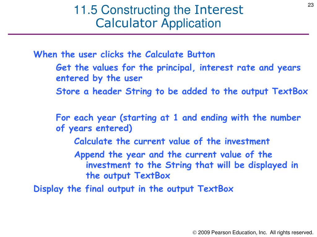 11.5 Constructing the InterestCalculator Application When the user clicks the Calculate Button Get the values for the principal, interest rate and years entered by the user Store a header String to be added to the output TextBox For each year (starting at 1 and ending with the number of years entered) Calculate the current value of the investment Append the year and the current value of the investment to the String that will be displayed in the output TextBox Display the final output in the output TextBox