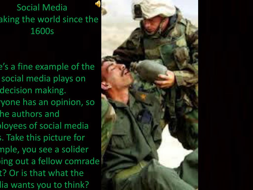 Social Media Cloaking the world since the 1600s Here’s a fine example of the role social media plays on our decision making. Everyone has an opinion, so do the authors and employees of social media sites. Take this picture for example, you see a solider helping out a fellow comrade right? Or is that what the media wants you to think?