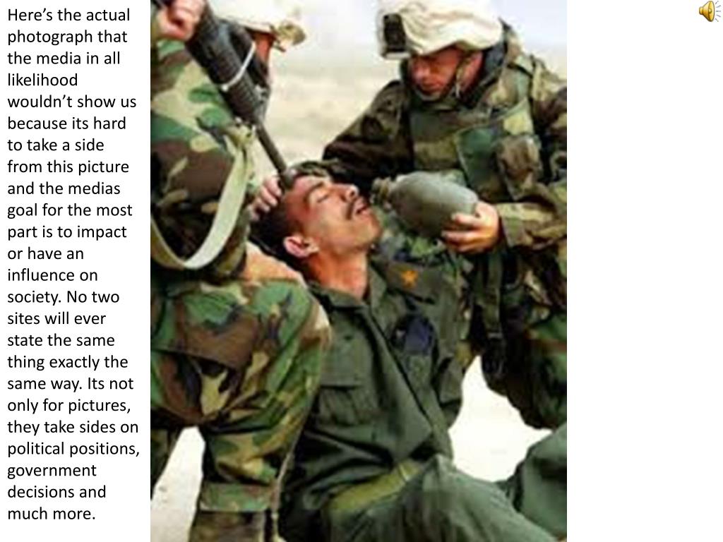Now What do you see here? A solider holding a prisoner of war at gun point reflecting how poorly we treat our enemies in the field. Or again, is that what they want you to think?