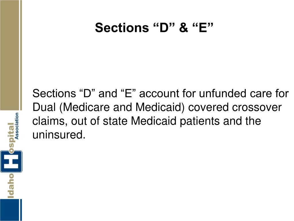 Sections “D” & “E” Sections “D” and “E” account for unfunded care for Dual (Medicare and Medicaid) covered crossover claims, out of state Medicaid patients and the uninsured.
