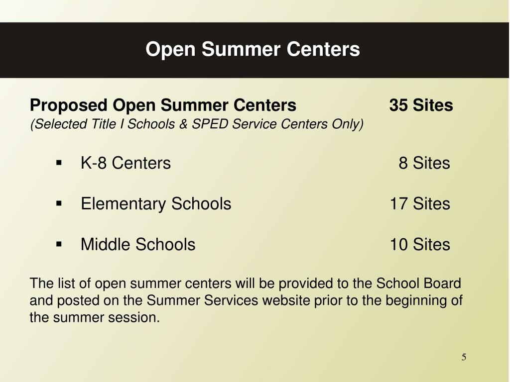 Open Summer Centers • Proposed Open Summer Centers 35 Sites • (Selected Title I Schools & SPED Service Centers Only) • K-8 Centers 8 Sites • Elementary Schools 17 Sites • Middle Schools 10 Sites • The list of open summer centers will be provided to the School Board • and posted on the Summer Services website prior to the beginning of • the summer session.