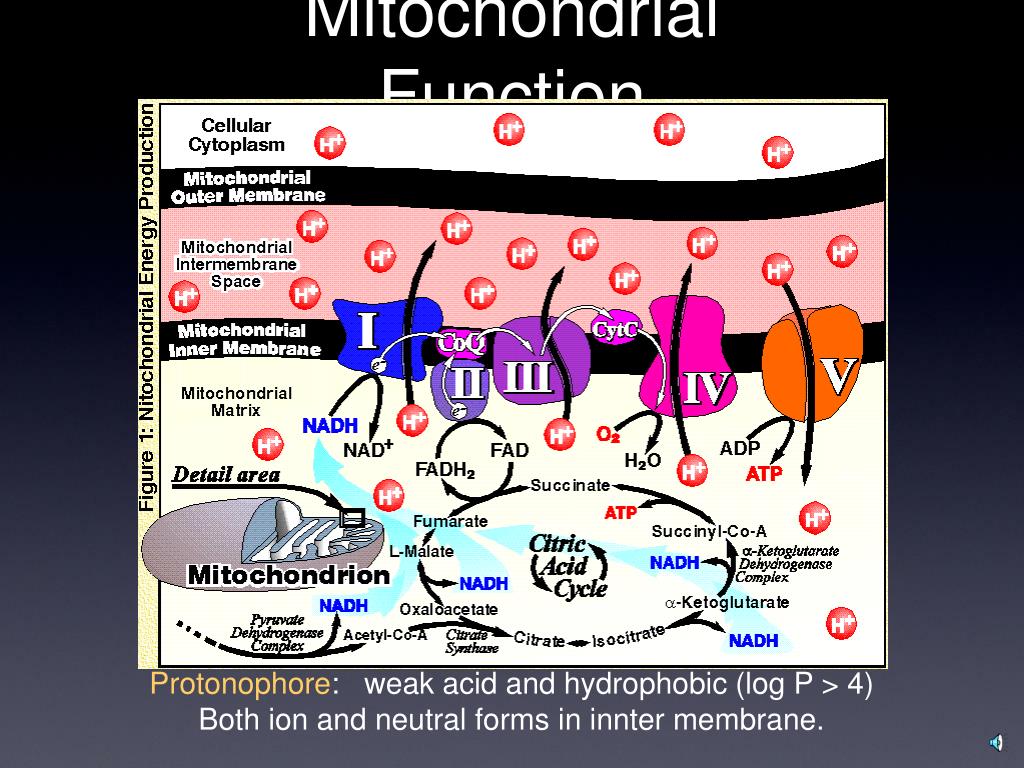 Mitochondrial Function Protonophore: weak acid and hydrophobic (log P > 4) Both ion and neutral forms in innter membrane.
