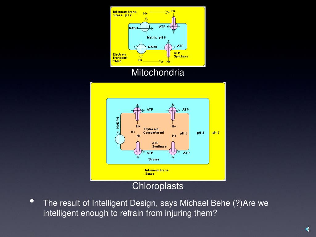 Mitochondria Chloroplasts • The result of Intelligent Design, says Michael Behe (?)Are we intelligent enough to refrain from injuring them?
