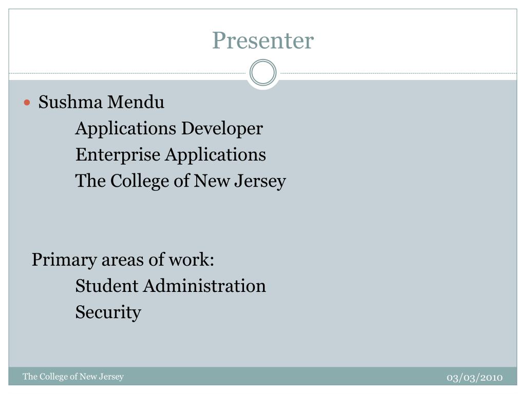 Presenter SushmaMendu Applications Developer Enterprise Applications The College of New Jersey Primary areas of work: Student Administration Security The College of New Jersey