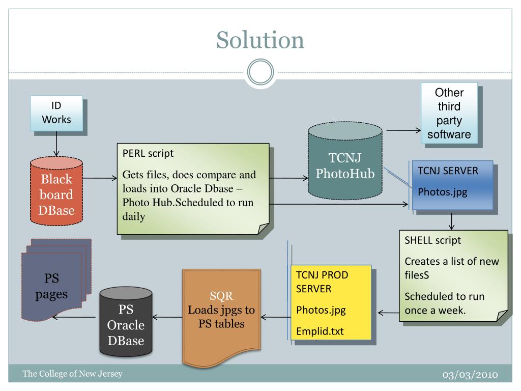 Solution Other third party software ID Works TCNJ PhotoHub PERL script Gets files, does compare and loads into Oracle Dbase – Photo Hub.Scheduled to run daily Black board DBase TCNJ SERVER Photos.jpg SHELL script Creates a list of new filesS Scheduled to run once a week. PS pages TCNJ PROD SERVER Photos.jpg Emplid.txt SQR Loads jpgs to PS tables PS Oracle DBase The College of New Jersey