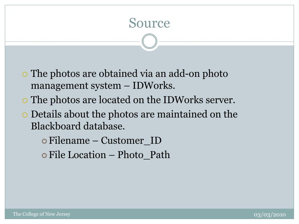 Source • The photos are obtained via an add-on photo management system – IDWorks. • The photos are located on the IDWorks server. • Details about the photos are maintained on the Blackboard database. • Filename – Customer_ID • File Location – Photo_Path The College of New Jersey