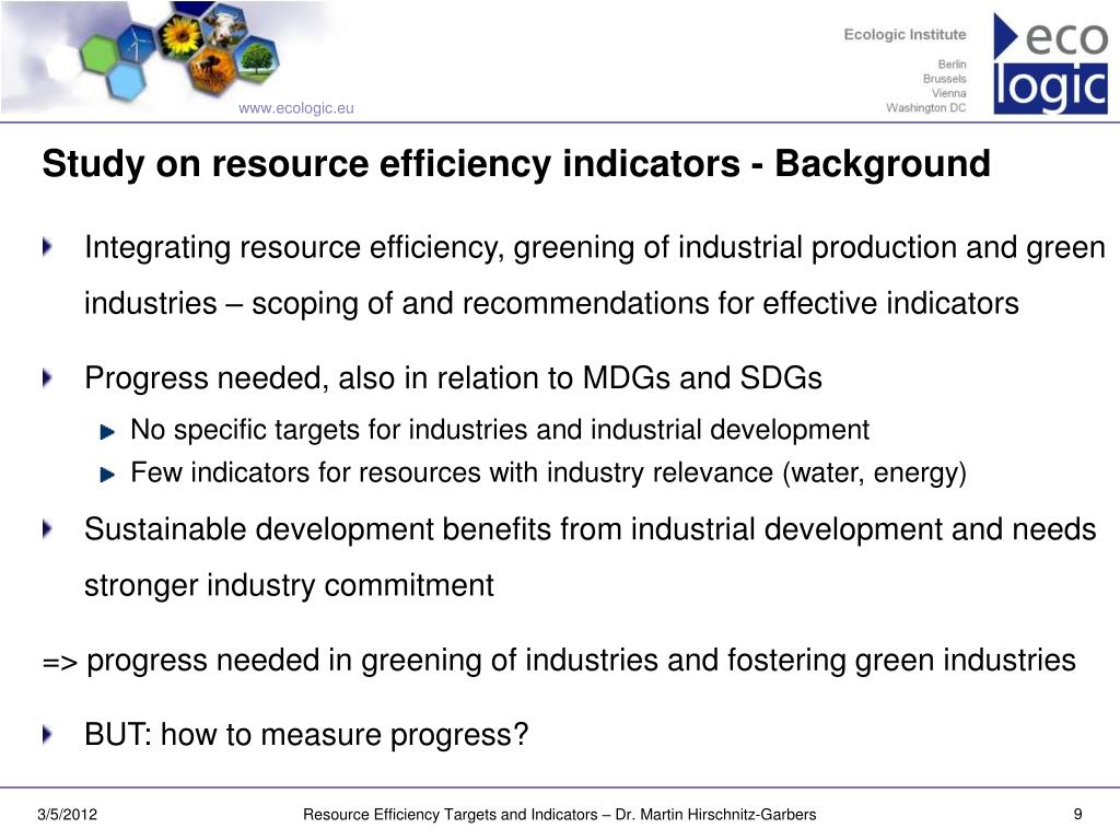 Study on resource efficiency indicators - Background • Integrating resource efficiency, greening of industrial production and green industries – scoping of and recommendations for effective indicators • Progress needed, also in relation to MDGs and SDGs • No specific targets for industries and industrial development • Few indicators for resources with industry relevance (water, energy) • Sustainable development benefits from industrial development and needs stronger industry commitment => progress needed in greening of industries and fostering green industries • BUT: how to measure progress? Resource Efficiency Targets and Indicators – Dr. Martin Hirschnitz-Garbers