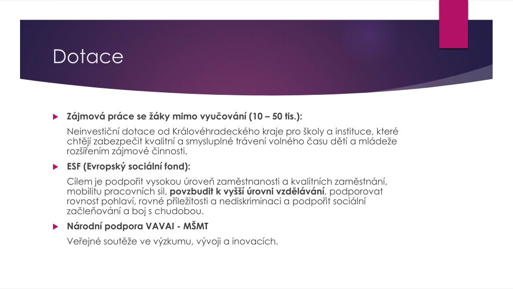 Dotace • Zájmová práce se žáky mimo vyučování (10 – 50 tis.): Neinvestiční dotace od Královéhradeckého kraje pro školy a instituce, které chtějí zabezpečit kvalitní a smysluplné trávení volného času dětí a mládeže rozšířením zájmové činnosti. • ESF (Evropský sociální fond): Cílem je podpořit vysokou úroveň zaměstnanosti a kvalitních zaměstnání, mobilitu pracovních sil, povzbudit k vyšší úrovni vzdělávání, podporovat rovnost pohlaví, rovné příležitosti a nediskriminaci a podpořit sociální začleňování a boj s chudobou. • Národní podpora VAVAI - MŠMT Veřejné soutěže ve výzkumu, vývoji a inovacích.