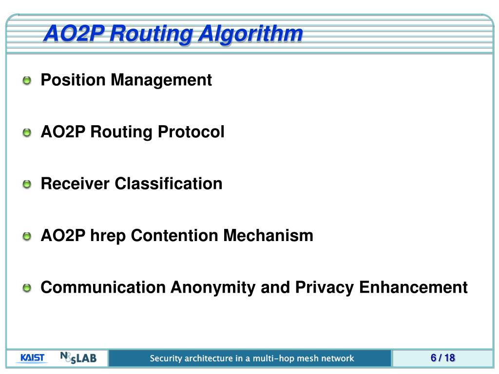 AO2P Routing Algorithm • Position Management • AO2P Routing Protocol • Receiver Classification • AO2P hrep Contention Mechanism • Communication Anonymity and Privacy Enhancement Security architecture in a multi-hop mesh network