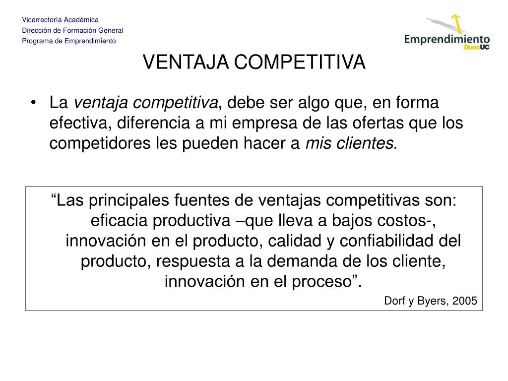 VENTAJA COMPETITIVA • La ventaja competitiva, debe ser algo que, en forma efectiva, diferencia a mi empresa de las ofertas que los competidores les pueden hacer a mis clientes. “Las principales fuentes de ventajas competitivas son: eficacia productiva –que lleva a bajos costos-, innovación en el producto, calidad y confiabilidad del producto, respuesta a la demanda de los cliente, innovación en el proceso”. Dorf y Byers, 2005