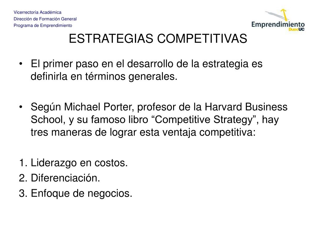 ESTRATEGIAS COMPETITIVAS • El primer paso en el desarrollo de la estrategia es definirla en términos generales. • Según Michael Porter, profesor de la Harvard Business School, y su famoso libro “Competitive Strategy”, hay tres maneras de lograr esta ventaja competitiva: • Liderazgo en costos. • Diferenciación. • Enfoque de negocios.