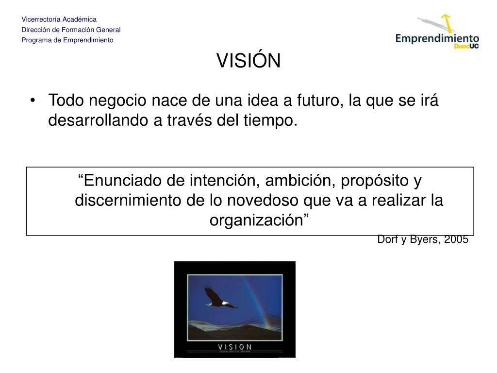 VISIÓN • Todo negocio nace de una idea a futuro, la que se irá desarrollando a través del tiempo. “Enunciado de intención, ambición, propósito y discernimiento de lo novedoso que va a realizar la organización” Dorf y Byers, 2005