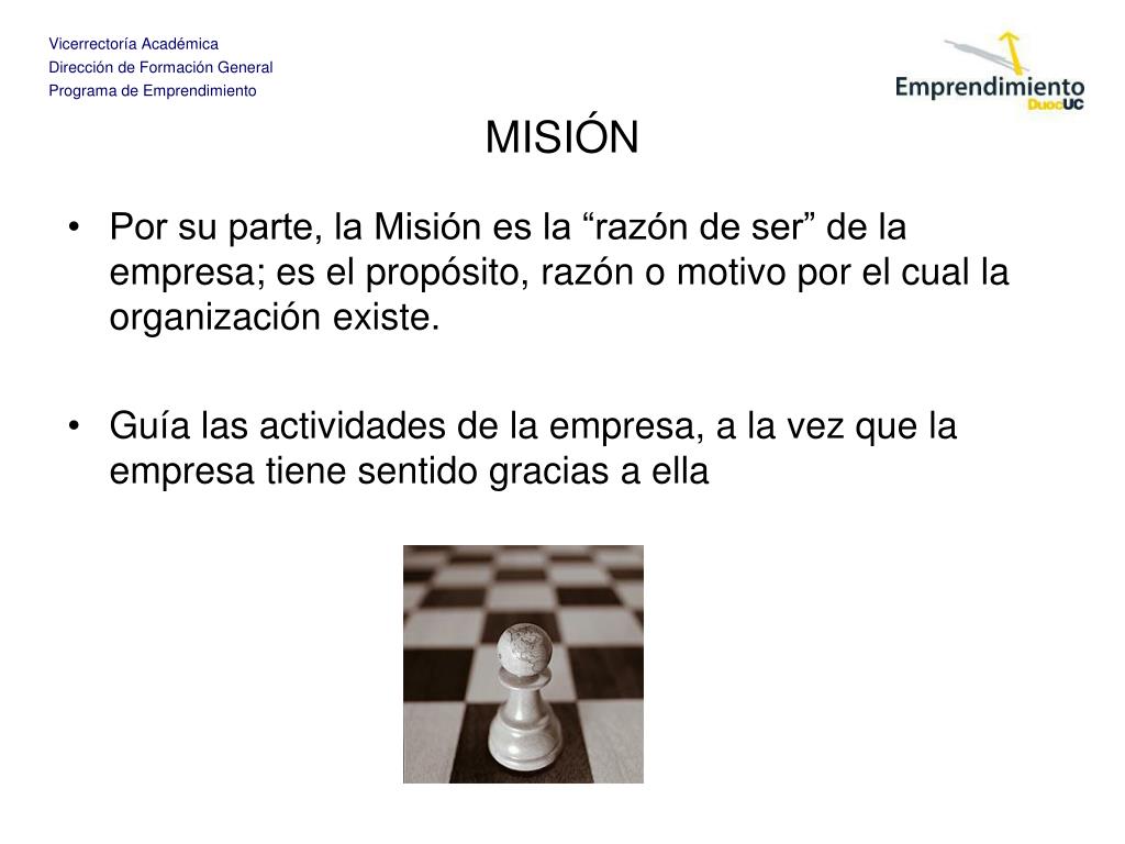 MISIÓN • Por su parte, la Misión es la “razón de ser” de la empresa; es el propósito, razón o motivo por el cual la organización existe. • Guía las actividades de la empresa, a la vez que la empresa tiene sentido gracias a ella
