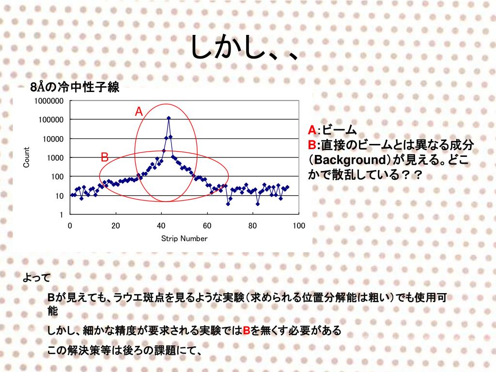 しかし、、 8Åの冷中性子線 A A:ビーム B:直接のビームとは異なる成分(Background)が見える。どこかで散乱している?? B • よって • Bが見えても、ラウエ斑点を見るような実験(求められる位置分解能は粗い)でも使用可能 • しかし、細かな精度が要求される実験ではBを無くす必要がある • この解決策等は後ろの課題にて、