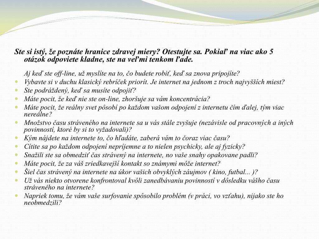 Ste si istý, že poznáte hranice zdravej miery? Otestujte sa. Pokiaľ na viac ako 5 otázok odpoviete kladne, ste na veľmi tenkom ľade.Aj keď ste off-line, už myslíte na to, čo budete robiť, keď sa znova pripojíte? • Vybavte si v duchu klasický rebríček priorít. Je internet na jednom z troch najvyšších miest? • Ste podráždený, keď sa musíte odpojiť? • Máte pocit, že keď nie ste on-line, zhoršuje sa vám koncentrácia? • Máte pocit, že reálny svet pôsobí po každom vašom odpojení z internetu čím ďalej, tým viac nereálne? • Množstvo času stráveného na internete sa u vás stále zvyšuje (nezávisle od pracovných a iných povinností, ktoré by si to vyžadovali)? • Kým nájdete na internete to, čo hľadáte, zaberá vám to čoraz viac času? • Cítite sa po každom odpojení nepríjemne a to nielen psychicky, ale aj fyzicky? • Snažili ste sa obmedziť čas strávený na internete, no vaše snahy opakovane padli? • Máte pocit, že za váš zriedkavejší kontakt so známymi môže internet? • Šiel čas strávený na internete na úkor vašich obvyklých záujmov ( kino, futbal... )? • Už vás niekto otvorene konfrontoval kvôli zanedbávaniu povinností v dôsledku vášho času stráveného na internete? • Napriek tomu, že vám vaše surfovanie spôsobilo problém (v práci, vo vzťahu), nijako ste ho neobmedzili?