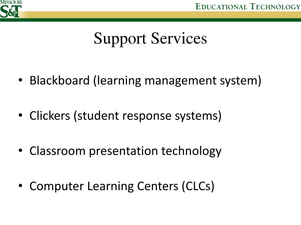 Support Services • Blackboard (learning management system) • Clickers (student response systems) • Classroom presentation technology • Computer Learning Centers (CLCs)