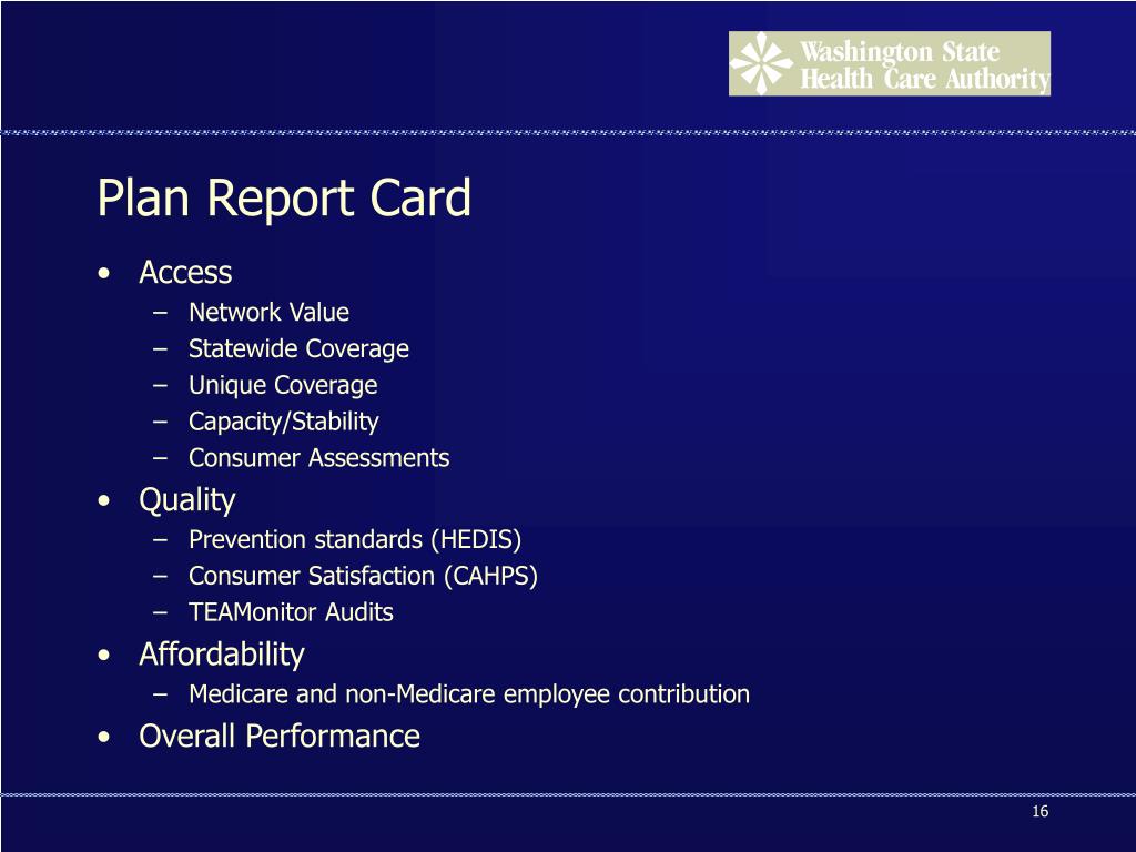 Plan Report Card • Access • Network Value • Statewide Coverage • Unique Coverage • Capacity/Stability • Consumer Assessments • Quality • Prevention standards (HEDIS) • Consumer Satisfaction (CAHPS) • TEAMonitor Audits • Affordability • Medicare and non-Medicare employee contribution • Overall Performance