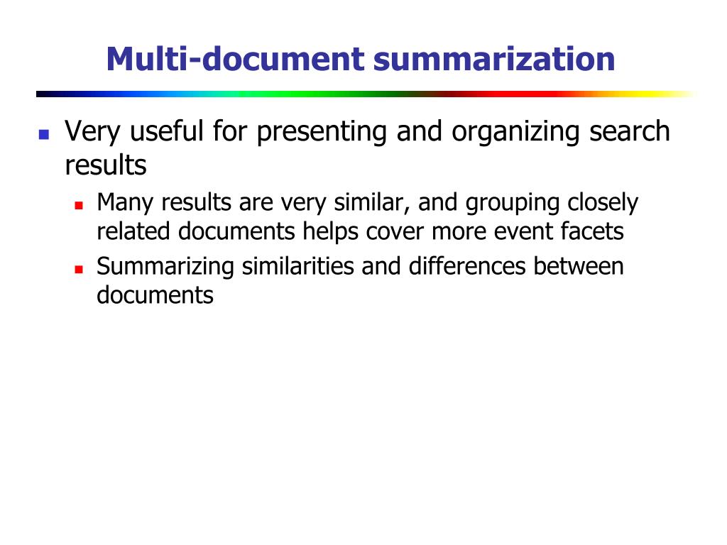 Multi-document summarization • Very useful for presenting and organizing search results • Many results are very similar, and grouping closely related documents helps cover more event facets • Summarizing similarities and differences between documents