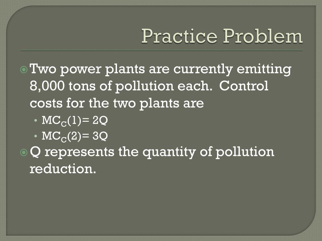 Practice Problem • Two power plants are currently emitting 8,000 tons of pollution each. Control costs for the two plants are • MCC(1)= 2Q • MCC(2)= 3Q • Q represents the quantity of pollution reduction.