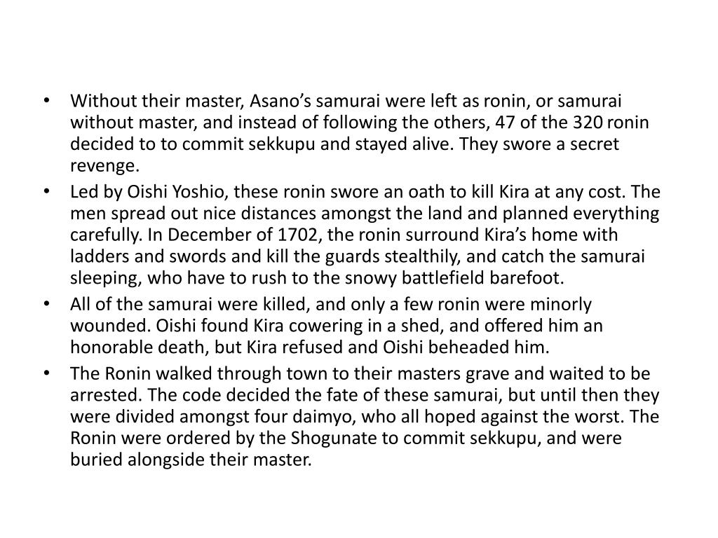 Without their master, Asano’s samurai were left as ronin, or samurai without master, and instead of following the others, 47 of the 320 ronin decided to to commit sekkupu and stayed alive. They swore a secret revenge. • Led by Oishi Yoshio, these ronin swore an oath to kill Kira at any cost. The men spread out nice distances amongst the land and planned everything carefully. In December of 1702, the ronin surround Kira’s home with ladders and swords and kill the guards stealthily, and catch the samurai sleeping, who have to rush to the snowy battlefield barefoot. • All of the samurai were killed, and only a few ronin were minorly wounded. Oishi found Kira cowering in a shed, and offered him an honorable death, but Kira refused and Oishi beheaded him. • The Ronin walked through town to their masters grave and waited to be arrested. The code decided the fate of these samurai, but until then they were divided amongst four daimyo, who all hoped against the worst. The Ronin were ordered by the Shogunate to commit sekkupu, and were buried alongside their master.