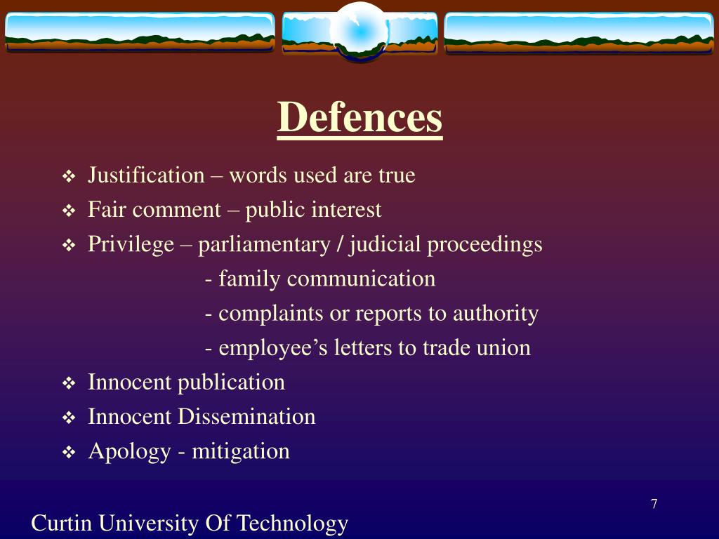 Defences • Justification – words used are true • Fair comment – public interest • Privilege – parliamentary / judicial proceedings - family communication - complaints or reports to authority - employee’s letters to trade union • Innocent publication • Innocent Dissemination • Apology - mitigation Curtin University Of Technology