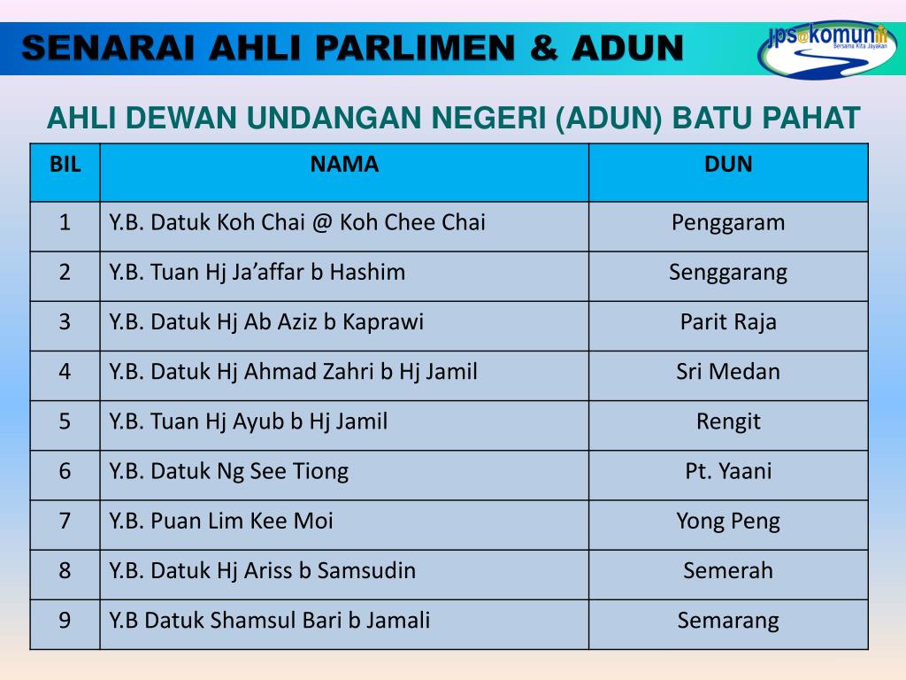 SENARAI AHLI PARLIMEN & ADUN AHLI DEWAN UNDANGAN NEGERI (ADUN) BATU PAHAT