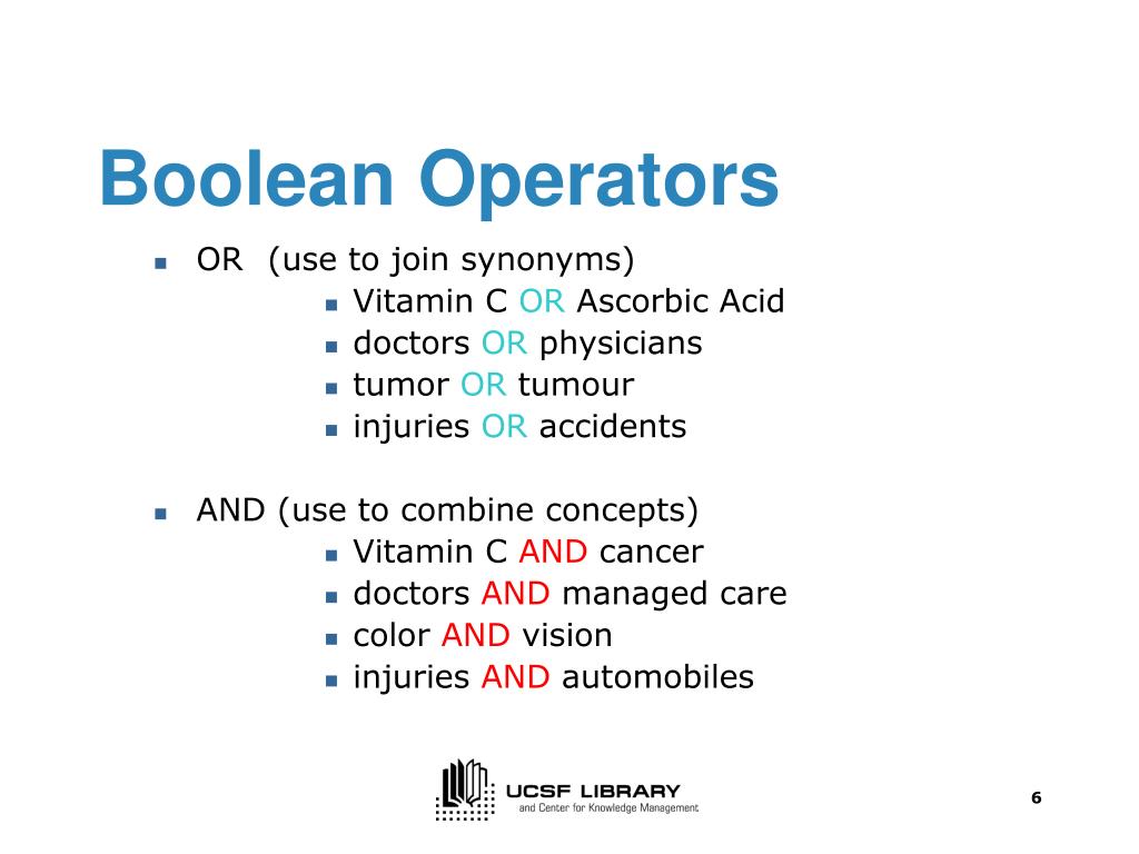 Boolean Operators • OR (use to join synonyms) • Vitamin C OR Ascorbic Acid • doctors OR physicians • tumor OR tumour • injuries OR accidents • AND (use to combine concepts) • Vitamin C AND cancer • doctors AND managed care • color AND vision • injuries AND automobiles