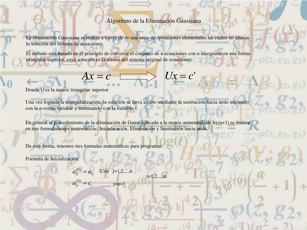 Algorítmo de la Eliminación Gaussiana La eliminación Gaussiana se realiza a través de de una serie de operaciones elementales las cuales no alteran la solución del sistema de acuaciones. El método esta basado en el principio de convertir el conjunto de n ecuaciones con n incognitas en una forma triangular superior, cuya solución es la misma del sistema original de ecuaciones. Donde U es la matriz triangular superior Una vez lograda la triangularización, la solución se lleva a cabo mediante la sustitución hacia atrás iniciando con la n-esima variable y terminando con la variable 1. En general el procedimiento de la eliminación de Gauss aplicada a la matriz aumentada de nx(n+1) se resume en tres formulaciones matemáticas; Inicialización, Eliminación y Sustitución hacia atrás. De esta forma, tenemos tres formulas matemáticas para programar: Formula de Inicialización: Con j=1,2,...,n i=1,2,...,n j=n+1