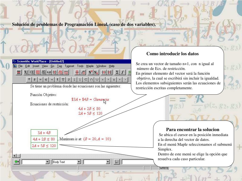 Solución de problemas de Programación Lineal. (caso de dos variables). Como introducir los datos Se crea un vector de tamaño n+1, con n igual al número de Ecs. de restricción. En primer elemento del vector será la función objetivo, la cual se escribirá sin incluir la igualdad. Los elementos subsiguientes serán las ecuaciones de restricción escritas completamente. Para encontrar la solucion Se ubica el cursor en la posición inmediata a la derecha del vector de datos. En el menú Maple seleccionamos el submenú Simplex. Dentro de este menú se elige la opción que resuelva cada caso particular.