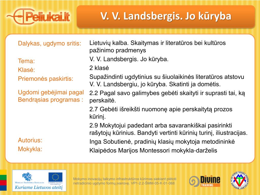 V. V. Landsbergis. Jo kūryba Lietuvių kalba. Skaitymas ir literatūros bei kultūros pažinimo pradmenys V. V. Landsbergis. Jo kūryba. 2 klasė Supažindinti ugdytinius su šiuolaikinės literatūros atstovu V. V. Landsbergiu, jo kūryba. Skatinti ja domėtis. 2.2 Pagal savo galimybes gebėti skaityti ir suprasti tai, ką perskaitė. 2.7 Gebėti išreikšti nuomonę apie perskaitytą prozos kūrinį. 2.9 Mokytojui padedant arba savarankiškai pasirinkti rašytojų kūrinius. Bandyti vertinti kūrinių turinį, iliustracijas. Inga Sobutienė, pradinių klasių mokytoja metodininkė Klaipėdos Marijos Montessori mokykla-darželis Dalykas, ugdymo sritis: Tema: Klasė: Priemonės paskirtis: Ugdomi gebėjimai pagal Bendrąsias programas : Autorius: Mokykla: