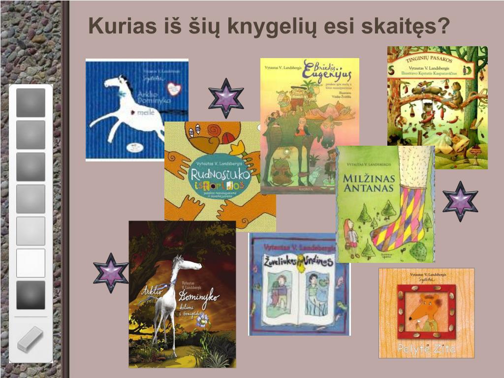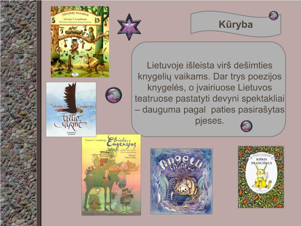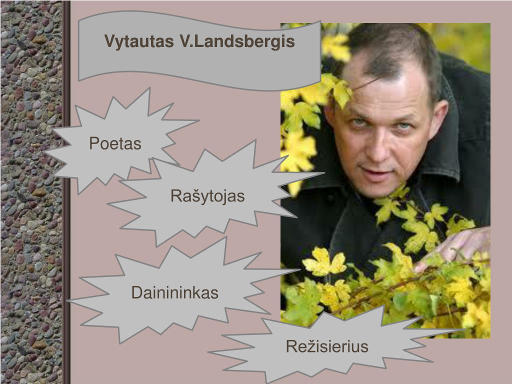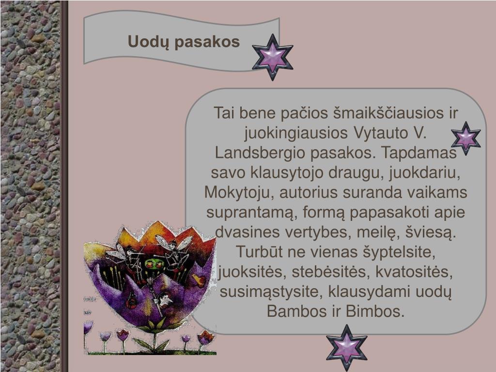 Šaltiniai: https://www.google.lt/search 2. http://www.bitute.lt/zurnalo-herojai/bitute/bitute-kalbina-rasytoja-rezisieriu-vytauta-v-landsbergi.html 3. http://www.moteris.lt/veidai/v-v-landsbergis-is-visu-darbu-man-labiausiai-patinka-buti-tevu.d?id=59673694 4.http://soniacoleman.com/Tutorials/PowerPointTemplates/pebbles.html 5.http://etc.usf.edu/presentations/extras/buttons/gems_buttons/Alexandrite/index.html 6. http://www.kidstime.lt/pasakos/48-pasakos/129-vvlandsbergis-uod-pasakos.html 7. http://www.lenagold.ru/fon/clipart/m/mes3.html 8. http://vvl.lt/lt/kas-as-esu