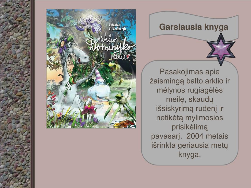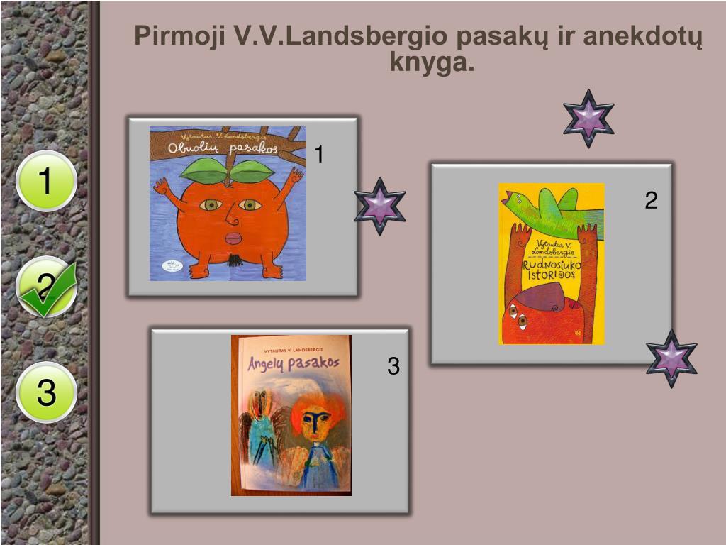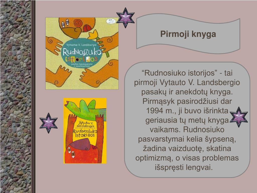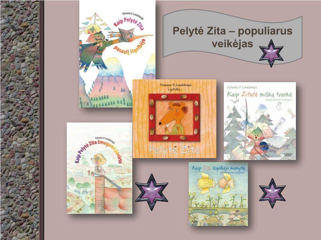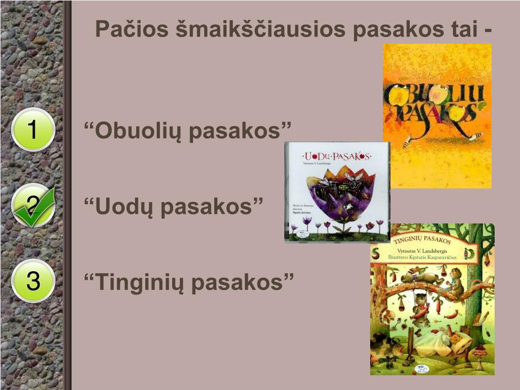 Šaltiniai: https://www.google.lt/search 2. http://www.bitute.lt/zurnalo-herojai/bitute/bitute-kalbina-rasytoja-rezisieriu-vytauta-v-landsbergi.html 3. http://www.moteris.lt/veidai/v-v-landsbergis-is-visu-darbu-man-labiausiai-patinka-buti-tevu.d?id=59673694 4.http://soniacoleman.com/Tutorials/PowerPointTemplates/pebbles.html 5.http://etc.usf.edu/presentations/extras/buttons/gems_buttons/Alexandrite/index.html 6. http://www.kidstime.lt/pasakos/48-pasakos/129-vvlandsbergis-uod-pasakos.html 7. http://www.lenagold.ru/fon/clipart/m/mes3.html 8. http://vvl.lt/lt/kas-as-esu