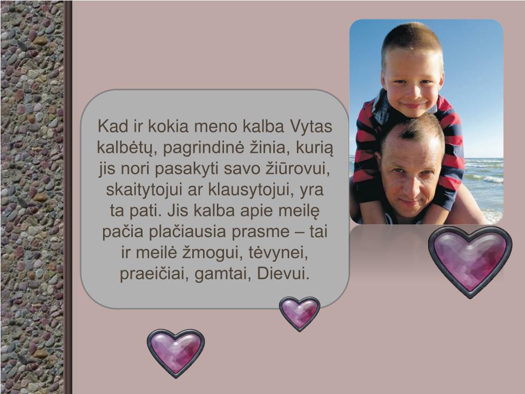 Kad ir kokia meno kalba Vytas kalbėtų, pagrindinė žinia, kurią jis nori pasakyti savo žiūrovui, skaitytojui ar klausytojui, yra ta pati. Jis kalba apie meilę pačia plačiausia prasme – tai ir meilė žmogui, tėvynei, praeičiai, gamtai, Dievui.