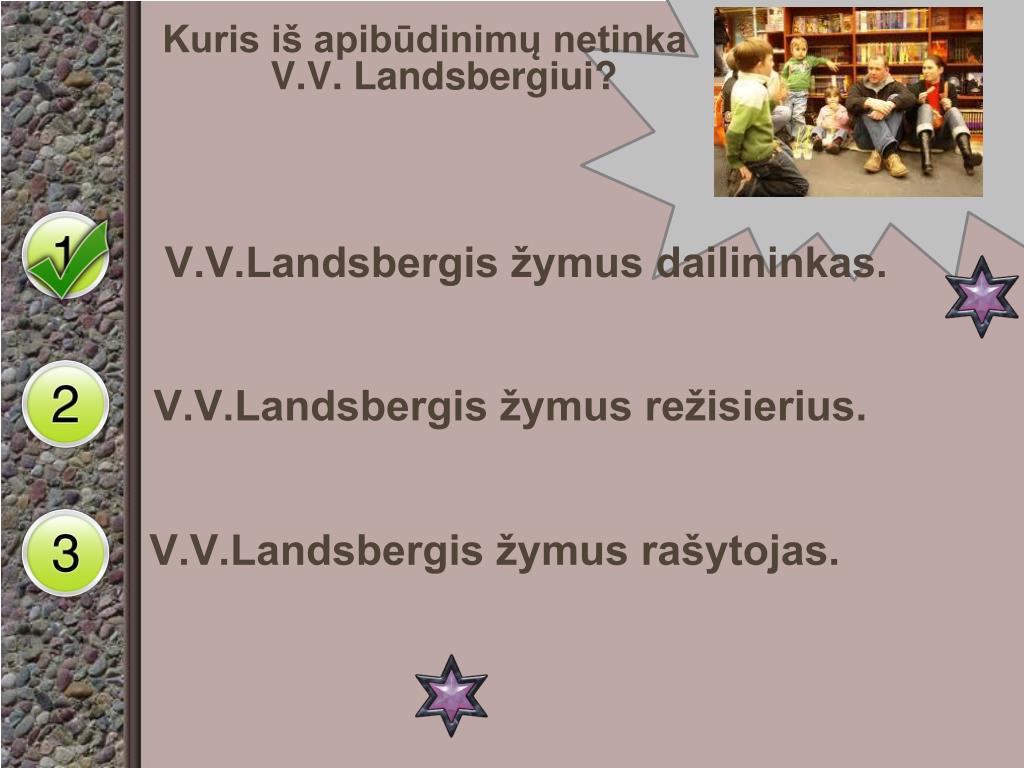 Kuris iš apibūdinimų netinka V.V. Landsbergiui? V.V.Landsbergis žymus dailininkas. V.V.Landsbergis žymus režisierius. V.V.Landsbergis žymus rašytojas.