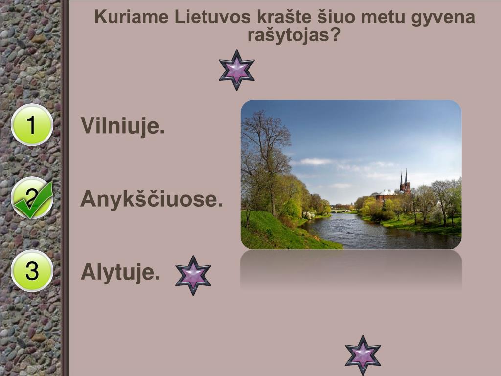 Kuriame Lietuvos krašte šiuo metu gyvena rašytojas? Vilniuje. Anykščiuose. Alytuje.