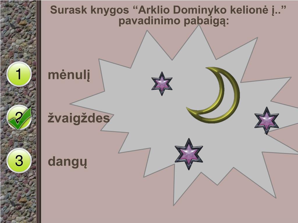 Surask knygos “Arklio Dominyko kelionė į..” pavadinimo pabaigą: mėnulį žvaigždes dangų