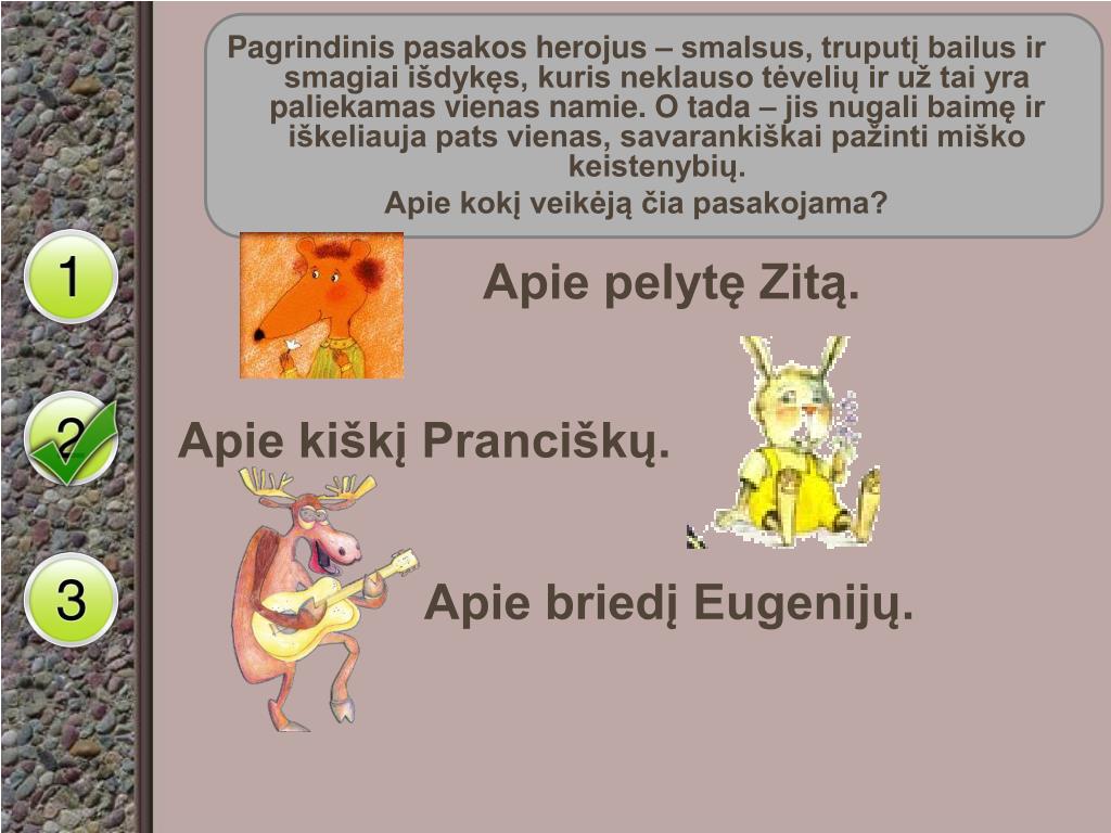 Pagrindinis pasakos herojus – smalsus, truputį bailus ir smagiai išdykęs, kuris neklauso tėvelių ir už tai yra paliekamas vienas namie. O tada – jis nugali baimę ir iškeliauja pats vienas, savarankiškai pažinti miško keistenybių. Apie kokį veikėją čia pasakojama? Apie pelytę Zitą. Apie kiškį Pranciškų. Apie briedį Eugenijų.