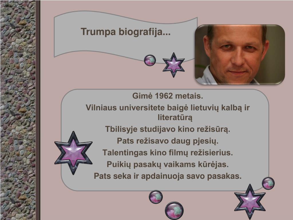 Trumpa biografija... Gimė 1962 metais. Vilniaus universitete baigė lietuvių kalbą ir literatūrą Tbilisyje studijavo kino režisūrą. Pats režisavo daug pjesių. Talentingas kino filmų režisierius. Puikių pasakų vaikams kūrėjas. Pats seka ir apdainuoja savo pasakas.