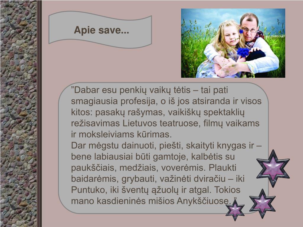 Apie save... ”Dabar esu penkių vaikų tėtis – tai pati smagiausia profesija, o iš jos atsiranda ir visos kitos: pasakų rašymas, vaikiškų spektaklių režisavimas Lietuvos teatruose, filmų vaikams ir moksleiviams kūrimas. Dar mėgstu dainuoti, piešti, skaityti knygas ir – bene labiausiai būti gamtoje, kalbėtis su paukščiais, medžiais, voverėmis. Plaukti baidarėmis, grybauti, važinėti dviračiu – iki Puntuko, iki šventų ąžuolų ir atgal. Tokios mano kasdieninės mišios Anykščiuose. ”