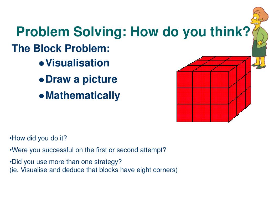 Problem Solving: How do you think? The Block Problem: • Visualisation • Draw a picture • Mathematically • How did you do it? • Were you successful on the first or second attempt? • Did you use more than one strategy? (ie. Visualise and deduce that blocks have eight corners)