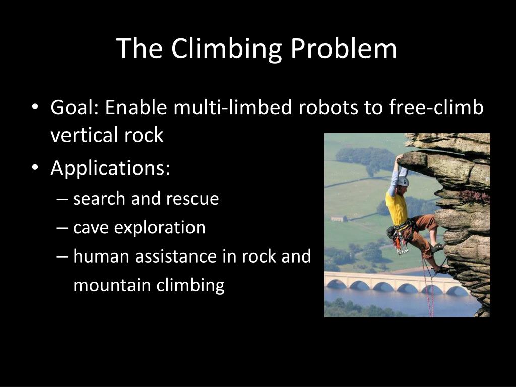 The Climbing Problem • Goal: Enable multi-limbed robots to free-climb vertical rock • Applications: • search and rescue • cave exploration • human assistance in rock and mountain climbing
