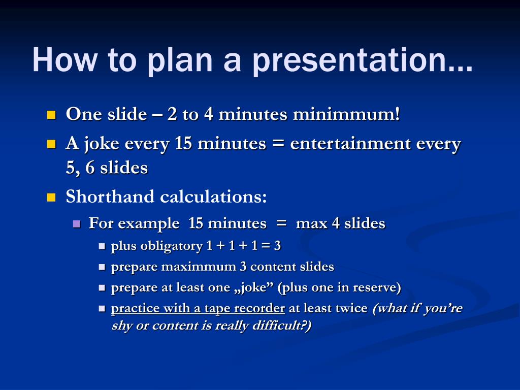 How to plan a presentation… • One slide – 2 to 4 minutes minimmum! • A joke every 15 minutes = entertainment every 5, 6 slides • Shorthand calculations: • For example 15 minutes = max 4 slides • plus obligatory 1 + 1 + 1 = 3 • prepare maximmum 3 content slides • prepare at least one „joke” (plus one in reserve) • practice with a tape recorder at least twice (what if you’re shy or content is really difficult?)