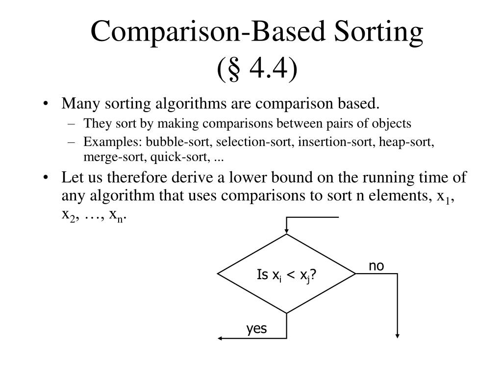 Many sorting algorithms are comparison based. They sort by making comparisons between pairs of objects Examples: bubble-sort, selection-sort, insertion-sort, heap-sort, merge-sort, quick-sort, ... Let us therefore derive a lower bound on the running time of any algorithm that uses comparisons to sort n elements, x1, x2, …, xn. Comparison-Based Sorting (§ 4.4) Is xi < xj? no yes