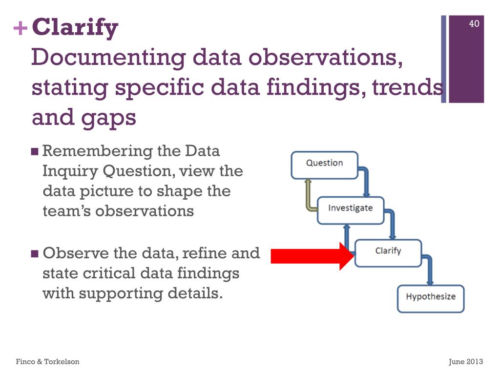ClarifyDocumenting data observations, stating specific data findings, trends and gaps • Remembering the Data Inquiry Question, view the data picture to shape the team’s observations • Observe the data, refine and state critical data findings with supporting details. Finco & Torkelson