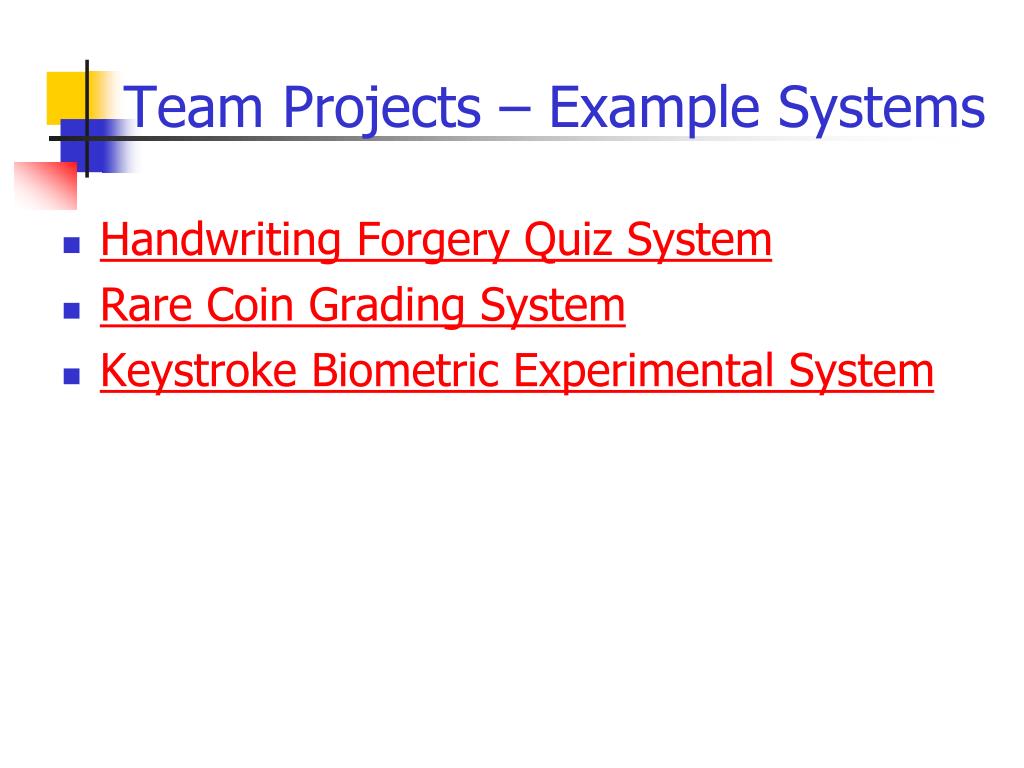 Team Projects – Example Systems • Handwriting Forgery Quiz System • Rare Coin Grading System • Keystroke Biometric Experimental System