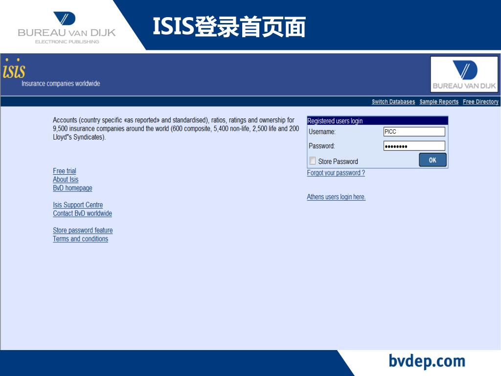 ISIS使用示例 • 题目:中国保险行业分析 • 通过帐号密码登录的网址:https://isis.bvdep.com • 通过IP地址登录的网址:https://isis.bvdep.com/ip