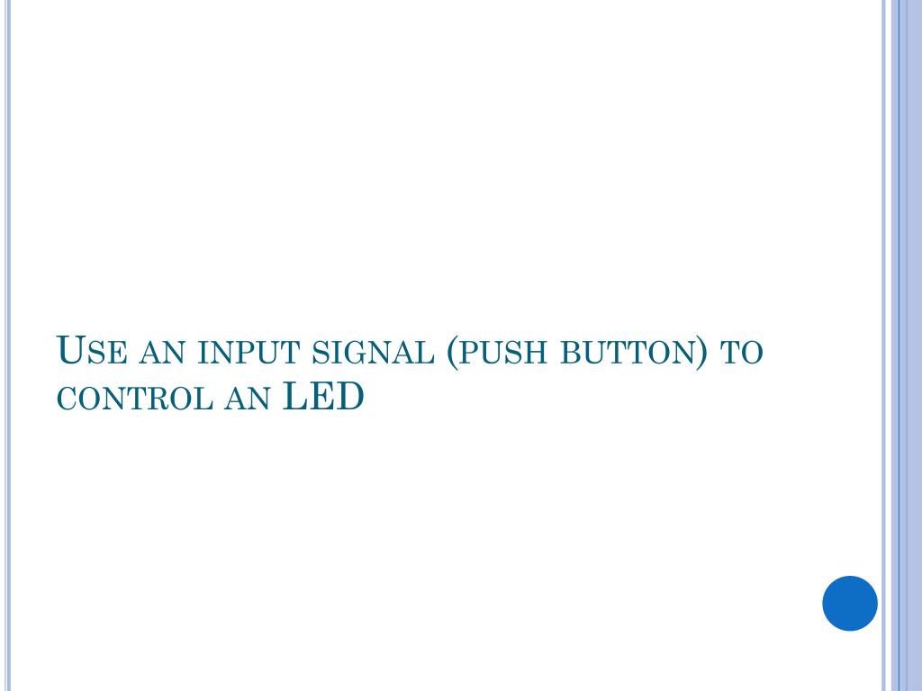 Input signal • void main( ){TRISB = 0x01 ; // set 1st bit of PORTB as INPUT While(1) // forever{ if(PORTB.F0 ==1) { PORTB.F1 = 1;} if(PORTB.F0 ==0) { PORTB.F1 = 0;} }}